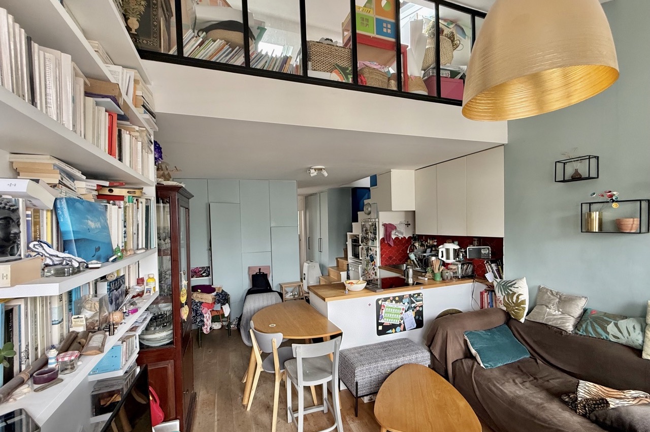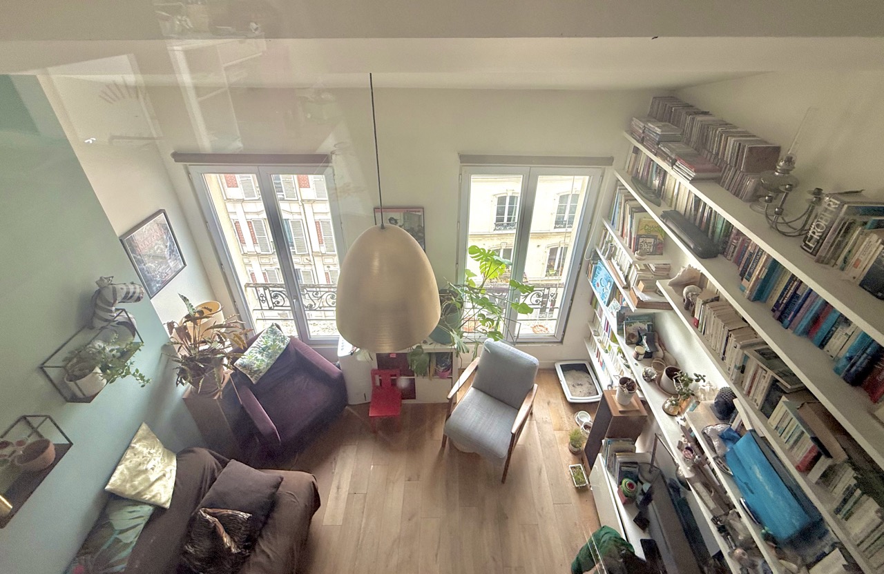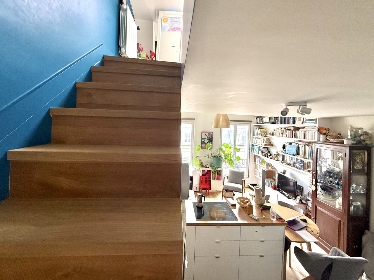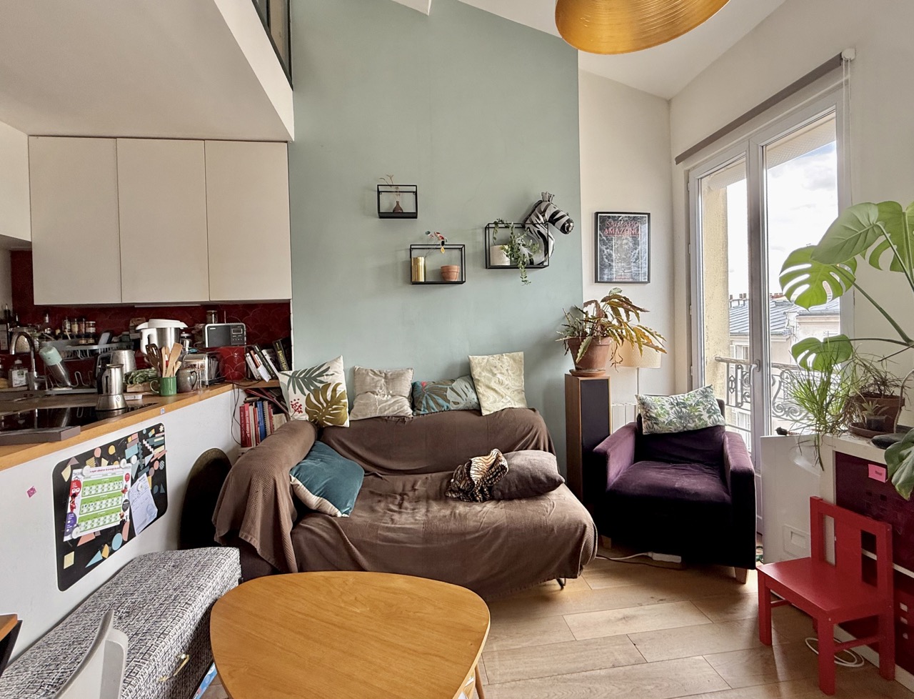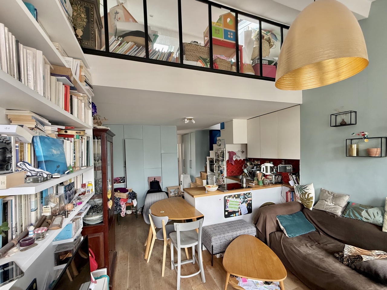 Au cœur de la vibrante rue de Belleville, à deux pas du Parc de Belleville, se dévoile ce duplex atypique de 51,69m2 (dont 36,82m2 Carrez) au 5e étage, offrant une expérience entre esprit loft et maison sous les toits. Le premier niveau séduit par son séjour baigné de lumière de par son exposition plein sud et une hauteur sous plafond de près de 3,80 m, créant une sensation d’espace et de respiration. La cuisine ouverte avec îlot s’intègre parfaitement à cet espace de vie. Il se poursuit par une chambre ouverte, une salle de bains avec baignoire, un WC séparé, ainsi que de nombreux rangements et bibliothèques sur mesure complètant ce niveau avec une fonctionnalité optimale. À l’étage, une vaste pièce sous toit de quasi 15m2, accessible en mezzanine, offre un volume supplémentaire spectaculaire actuellement en chambre d’enfants avec espace de jeux. Les deux Velux dévoilent des vues profonde sur les toits de Paris, et un espace vitré crée un lien visuel élégant avec le séjour en contrebas. Ce bien unique se distingue par ses perspectives, ses volumes et son caractère résolument atypique, au coeur d’un secteur particulièrement recherché. Idéalement adapté à une famille avec jeunes enfants ou à des amateurs d’espaces singuliers. Un cagibi complète le bien. Copropriété de 27 lots d’habitation. Montant charges annuelles 1160€.