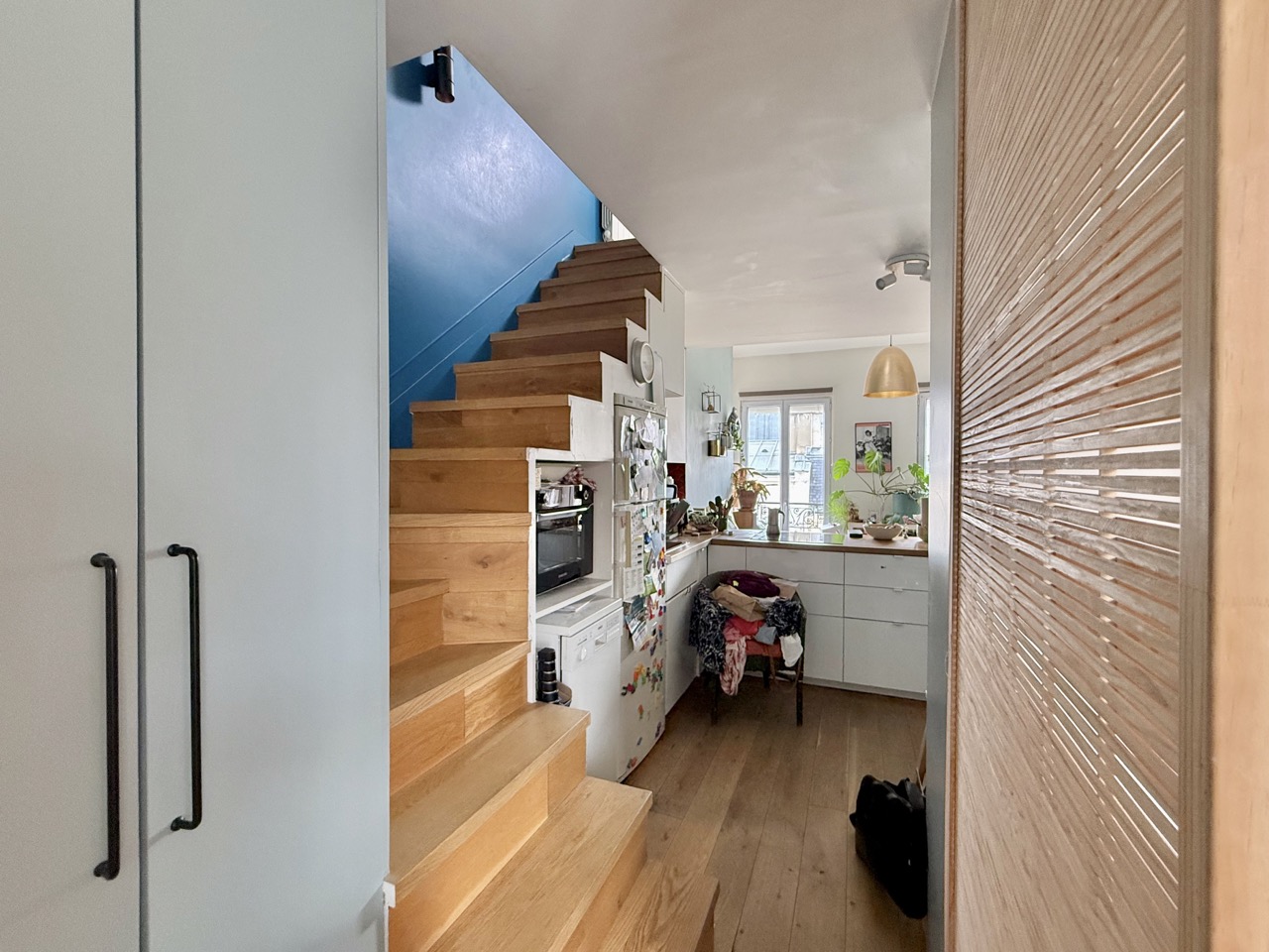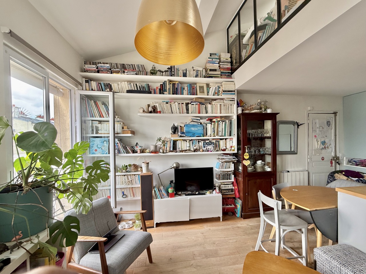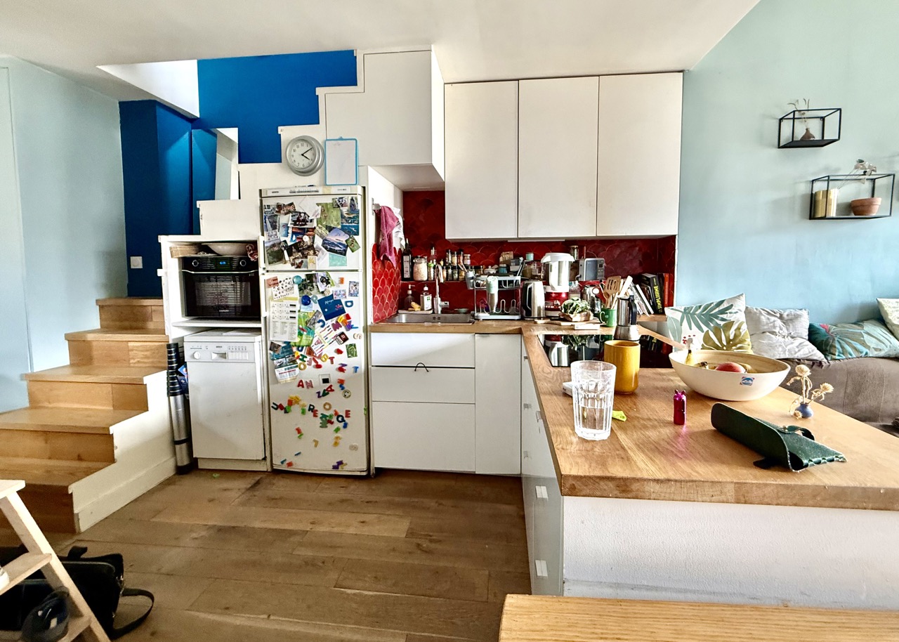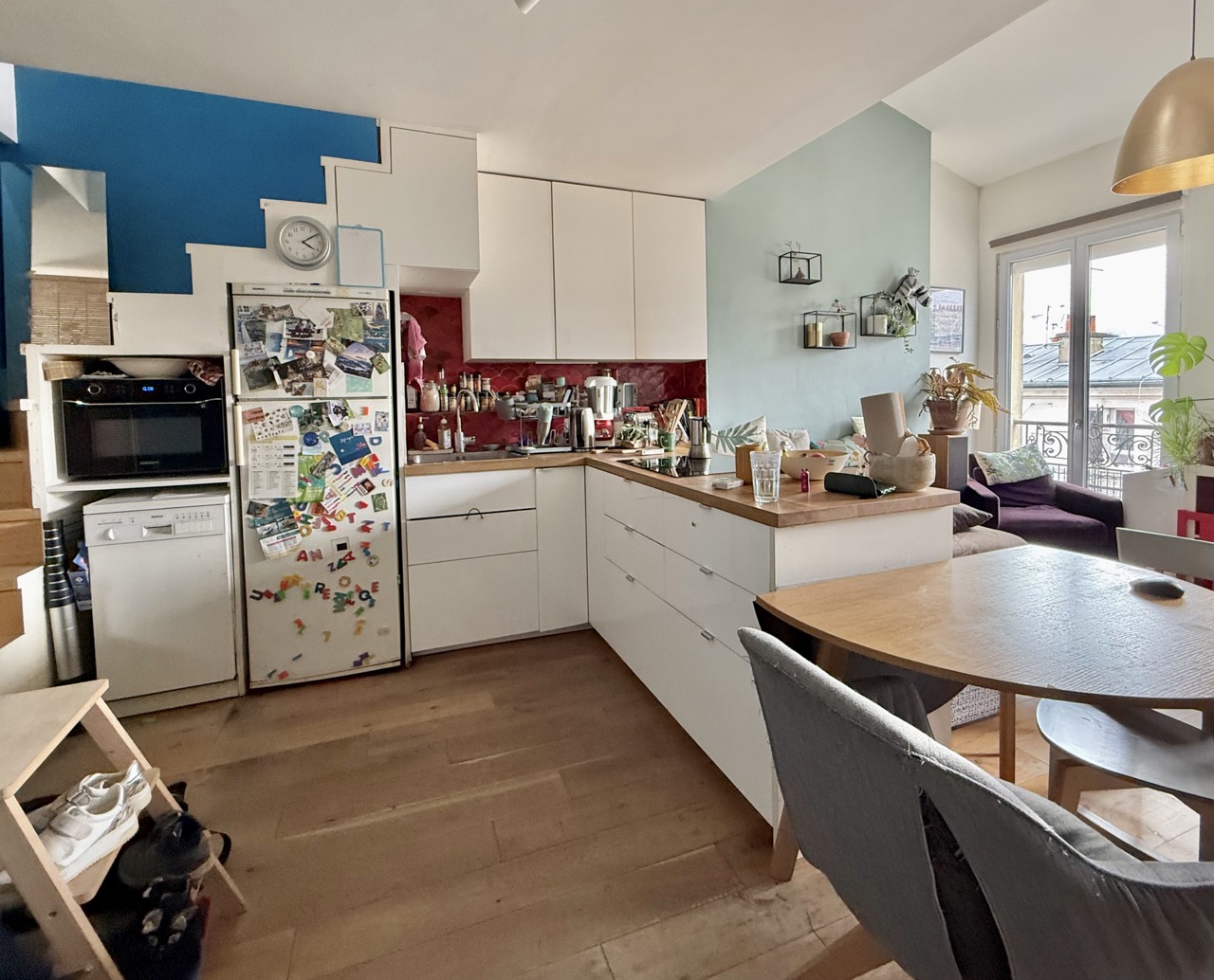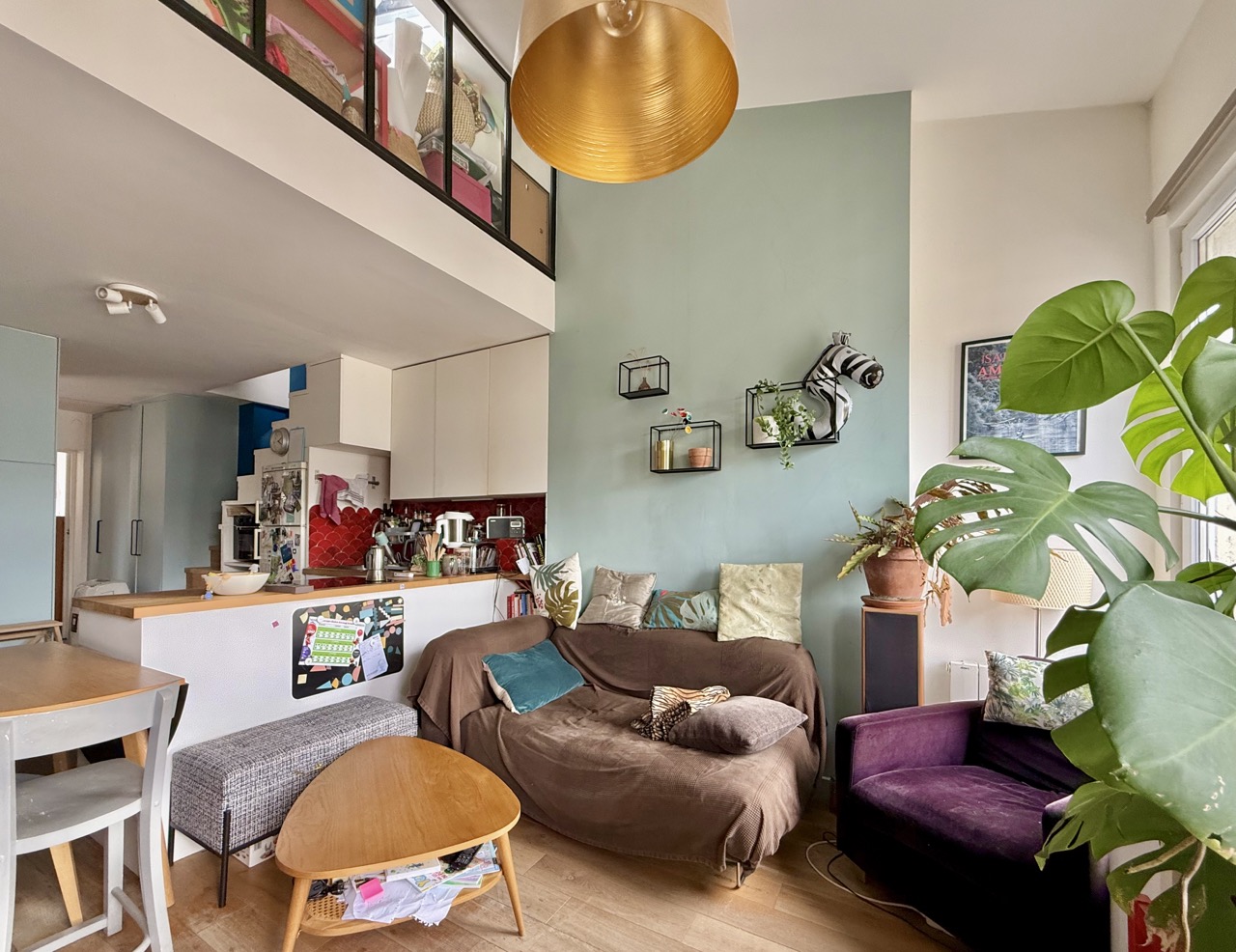 Au cœur de la vibrante rue de Belleville, à deux pas du Parc de Belleville, se dévoile ce duplex atypique de 51,69m2 (dont 36,82m2 Carrez) au 5e étage, offrant une expérience entre esprit loft et maison sous les toits. Le premier niveau séduit par son séjour baigné de lumière de par son exposition plein sud et une hauteur sous plafond de près de 3,80 m, créant une sensation d’espace et de respiration. La cuisine ouverte avec îlot s’intègre parfaitement à cet espace de vie. Il se poursuit par une chambre ouverte, une salle de bains avec baignoire, un WC séparé, ainsi que de nombreux rangements et bibliothèques sur mesure complètant ce niveau avec une fonctionnalité optimale. À l’étage, une vaste pièce sous toit de quasi 15m2, accessible en mezzanine, offre un volume supplémentaire spectaculaire actuellement en chambre d’enfants avec espace de jeux. Les deux Velux dévoilent des vues profonde sur les toits de Paris, et un espace vitré crée un lien visuel élégant avec le séjour en contrebas. Ce bien unique se distingue par ses perspectives, ses volumes et son caractère résolument atypique, au coeur d’un secteur particulièrement recherché. Idéalement adapté à une famille avec jeunes enfants ou à des amateurs d’espaces singuliers. Un cagibi complète le bien. Copropriété de 27 lots d’habitation. Montant charges annuelles 1160€.
