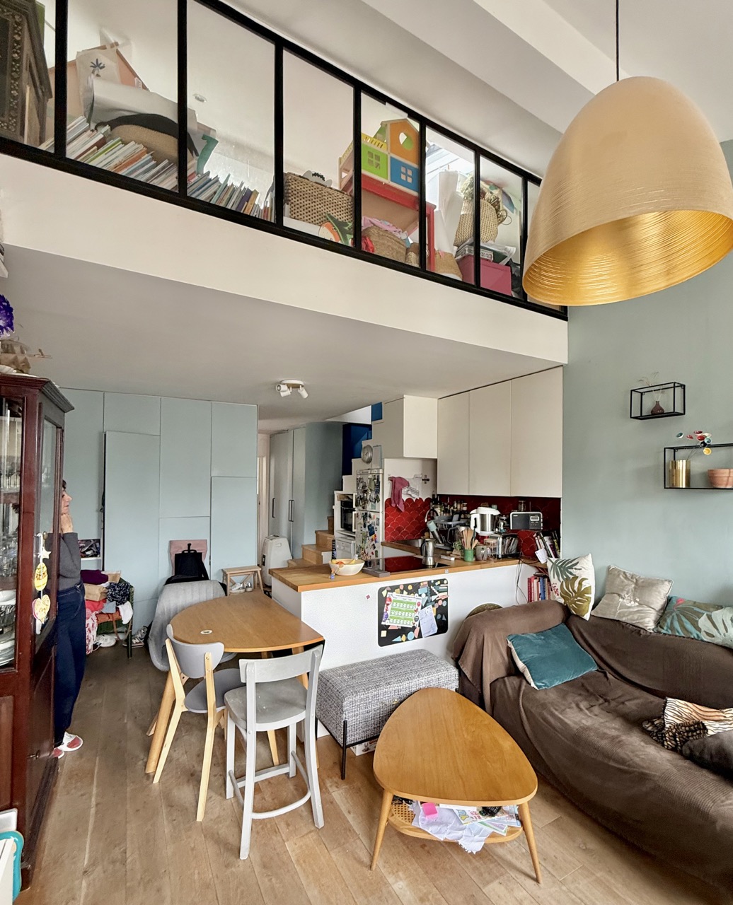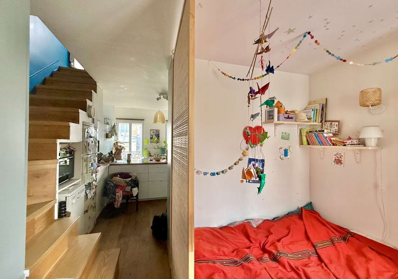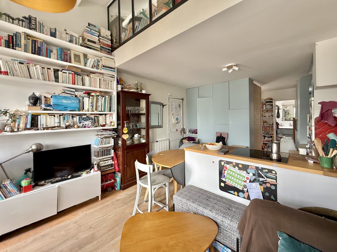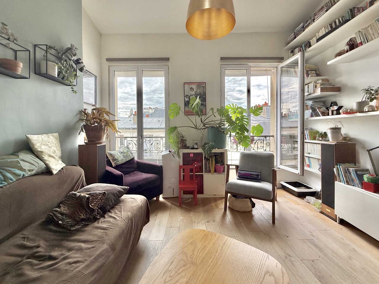 Au cœur de la vibrante rue de Belleville, à deux pas du Parc de Belleville, se dévoile ce duplex atypique de 51,69m2 (dont 36,82m2 Carrez) au 5e étage, offrant une expérience entre esprit loft et maison sous les toits. Le premier niveau séduit par son séjour baigné de lumière de par son exposition plein sud et une hauteur sous plafond de près de 3,80 m, créant une sensation d’espace et de respiration. La cuisine ouverte avec îlot s’intègre parfaitement à cet espace de vie. Il se poursuit par une chambre ouverte, une salle de bains avec baignoire, un WC séparé, ainsi que de nombreux rangements et bibliothèques sur mesure complètant ce niveau avec une fonctionnalité optimale. À l’étage, une vaste pièce sous toit de quasi 15m2, accessible en mezzanine, offre un volume supplémentaire spectaculaire actuellement en chambre d’enfants avec espace de jeux. Les deux Velux dévoilent des vues profonde sur les toits de Paris, et un espace vitré crée un lien visuel élégant avec le séjour en contrebas. Ce bien unique se distingue par ses perspectives, ses volumes et son caractère résolument atypique, au coeur d’un secteur particulièrement recherché. Idéalement adapté à une famille avec jeunes enfants ou à des amateurs d’espaces singuliers. Un cagibi complète le bien. Copropriété de 27 lots d’habitation. Montant charges annuelles 1160€.